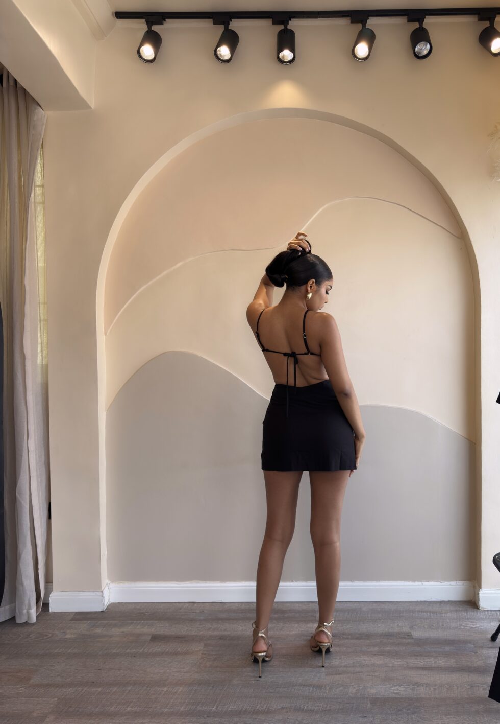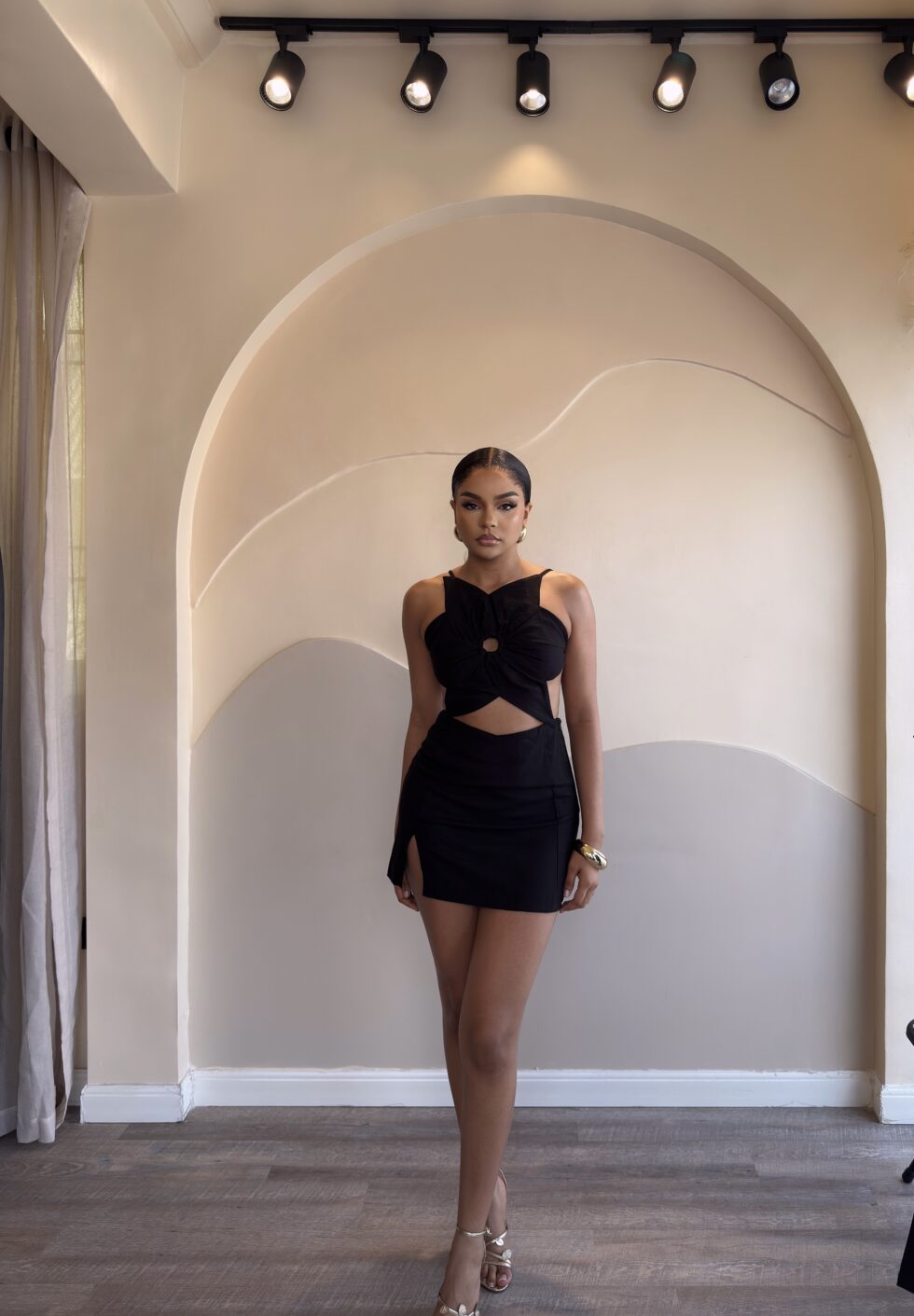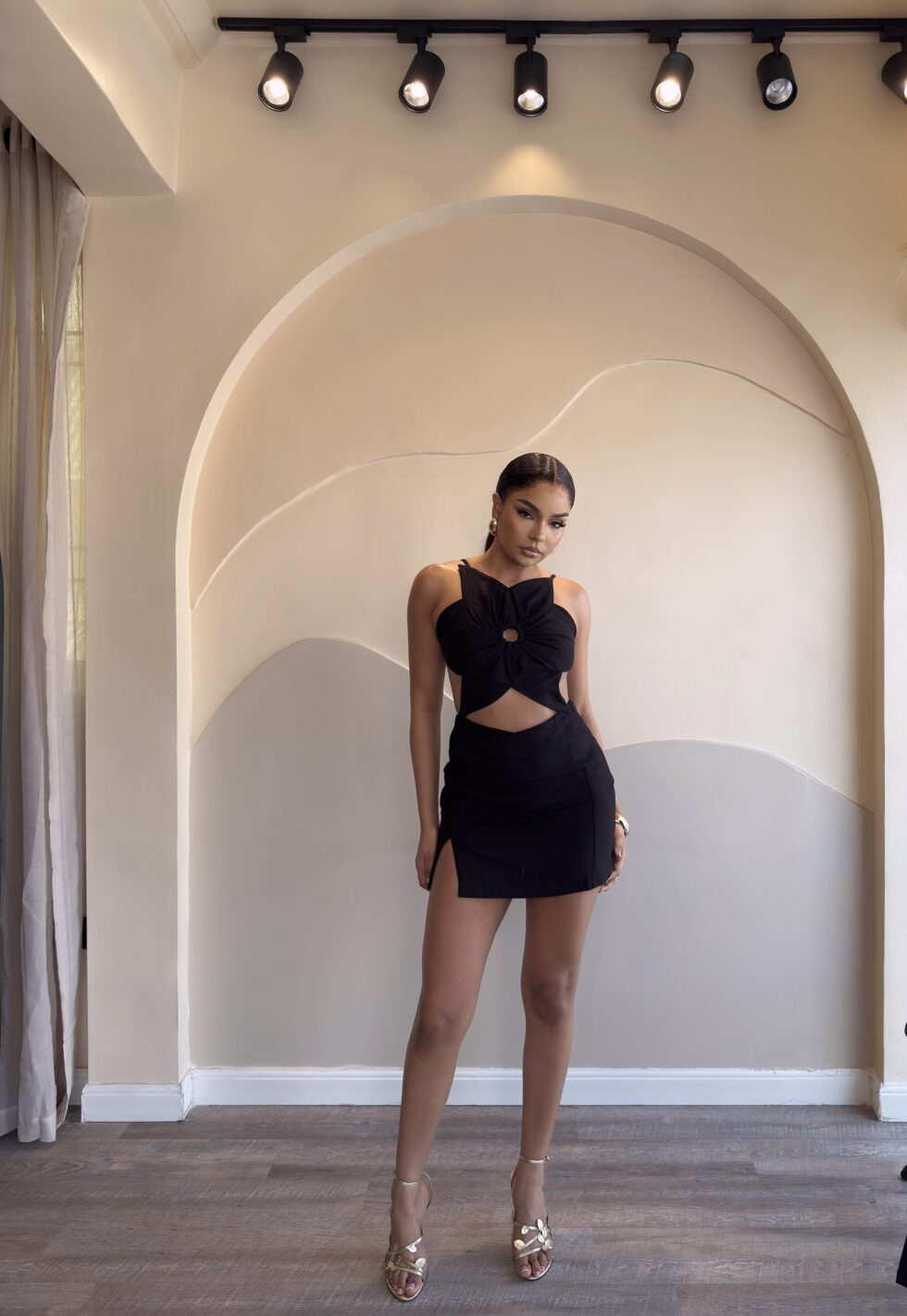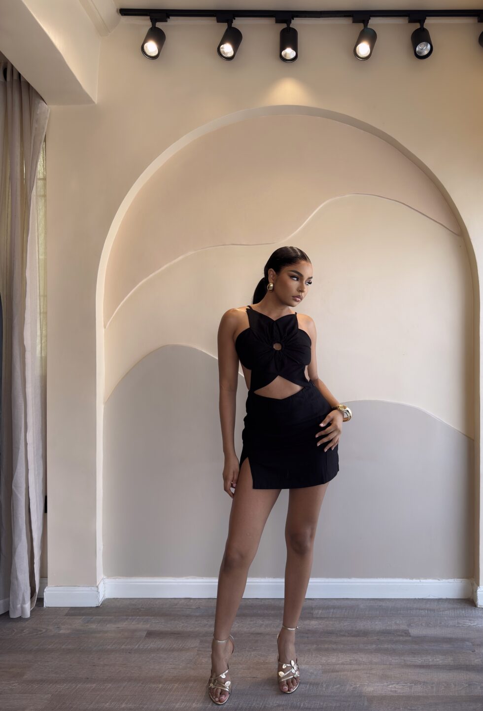 The Alana Mini Dress is designed for the modern muse who’s not afraid to shine. Featuring an eye-catching cut-out front with a knotted detail and a sleek open-back silhouette, this dress embraces your curves in all the right places. The thigh-high slit adds a touch of daring femininity, while the adjustable back straps ensure a comfortable and secure fit.