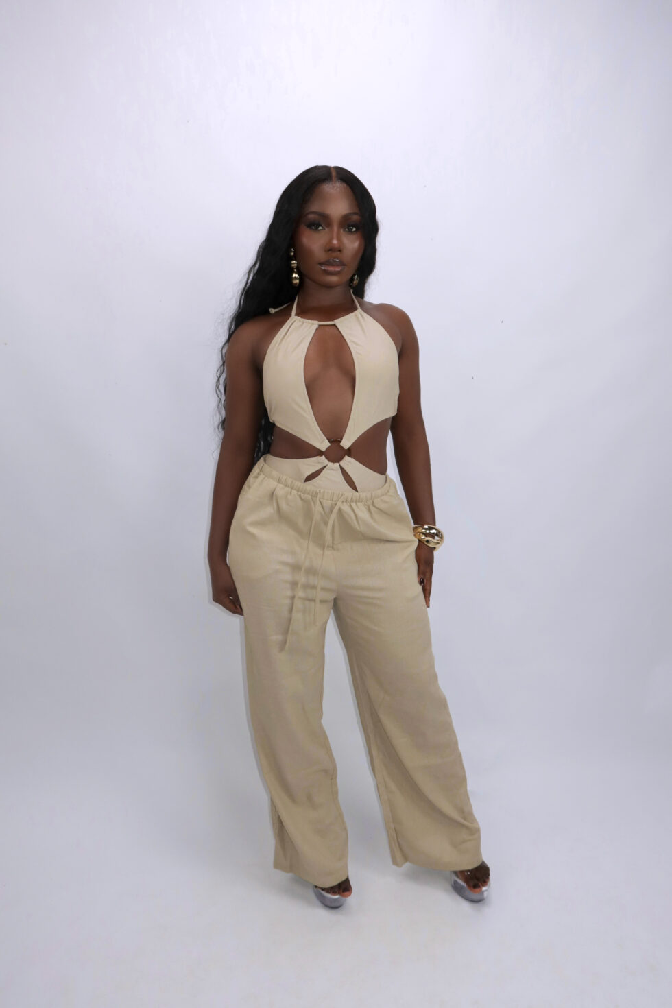 The Aleta Swimsuit is where sophistication meets bold, contemporary style. Crafted in a neutral beige hue that flatters every skin tone, this swimsuit features a plunging halter neckline and cut-out waist details with a statement ring accent that perfectly sculpts your silhouette.