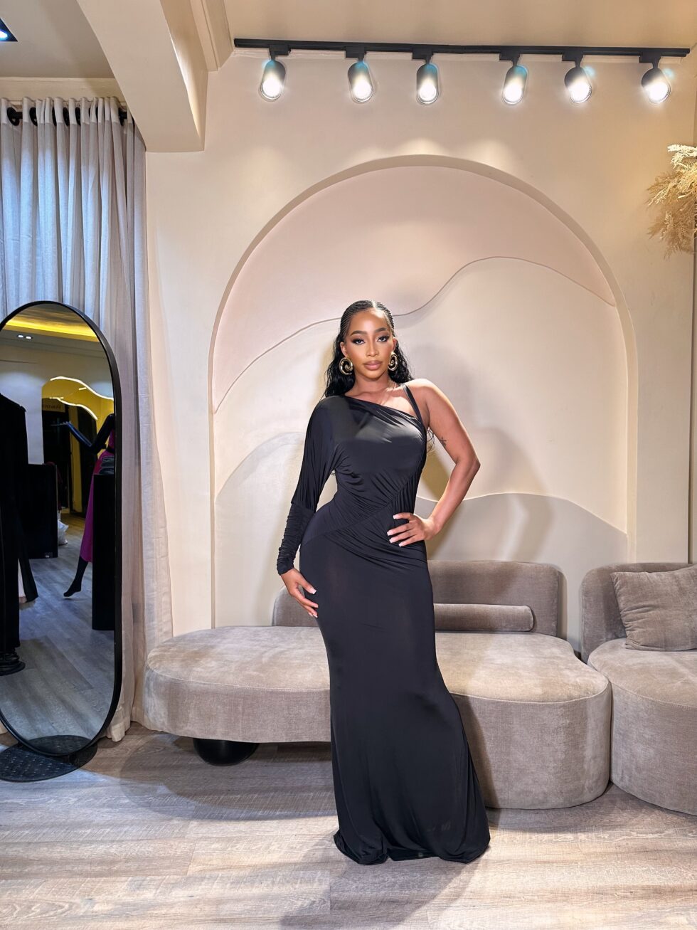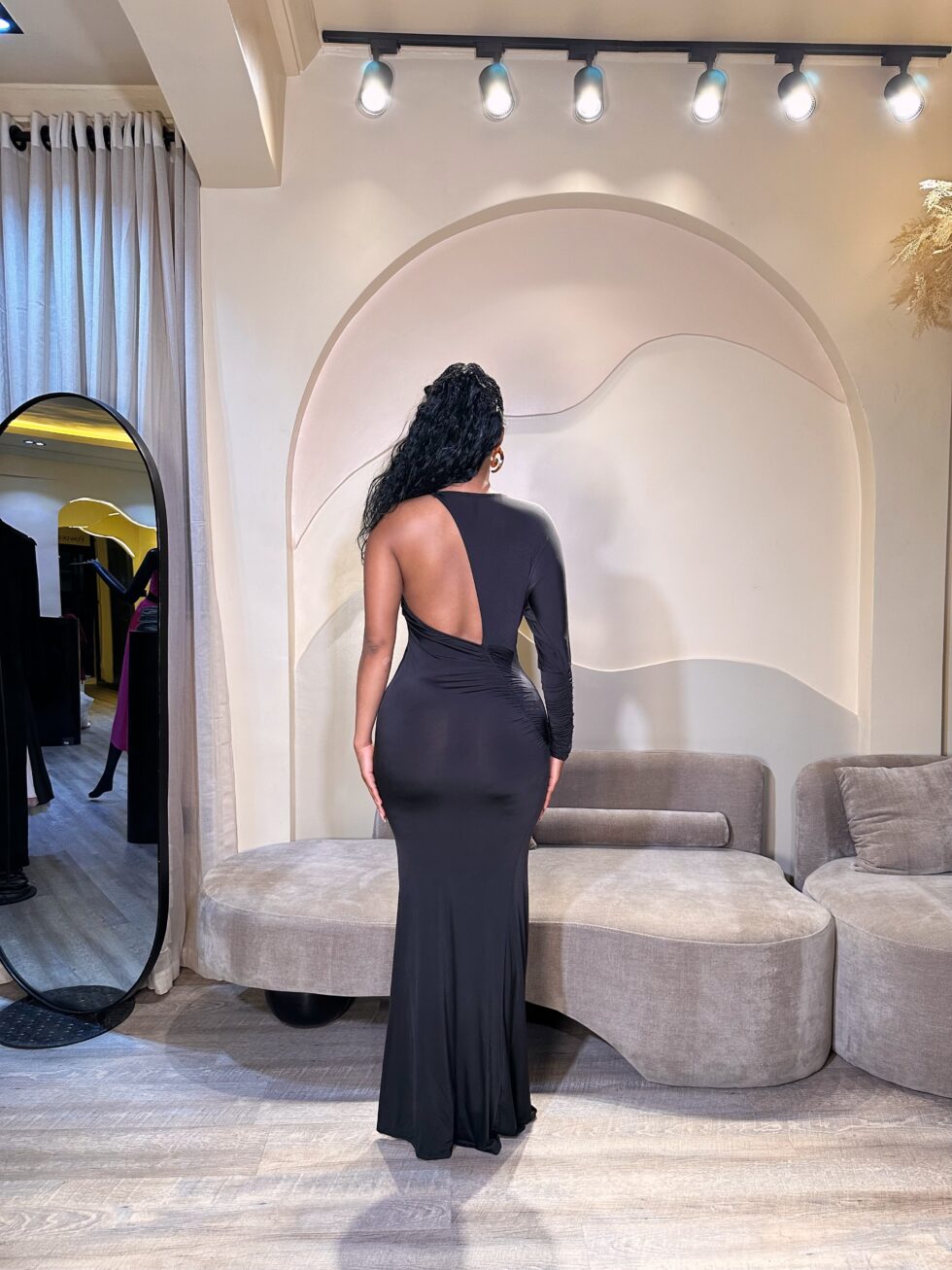 The asymmetrical one-shoulder design adds an artistic edge, while the long fitted sleeve contrasts beautifully with the bare shoulder, creating a captivating visual balance. Its floor-length finish elongates the figure, offering a statuesque silhouette that’s both powerful and feminine.