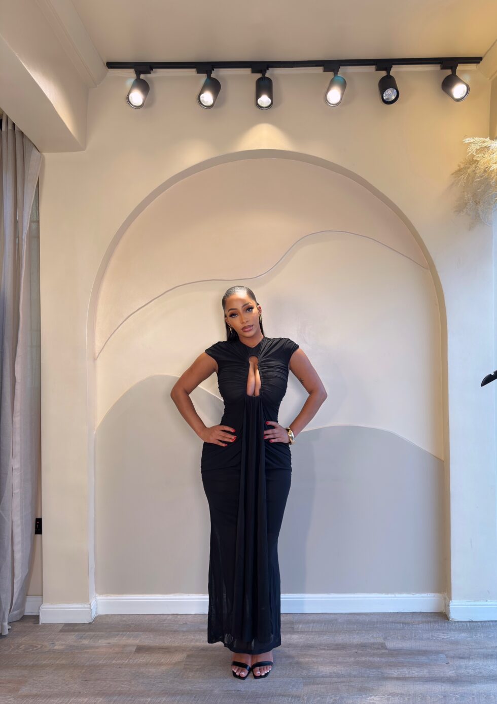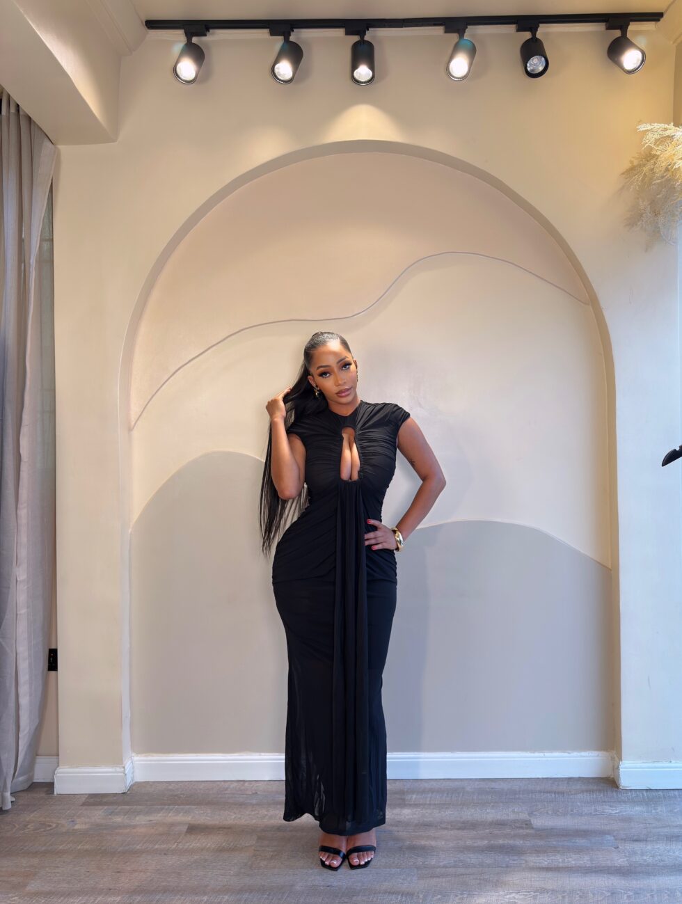 Turn heads in the Dasia Maxi Dress — a sultry yet sophisticated black gown that effortlessly accentuates your curves. With its daring front keyhole cutout and artful draping, this show-stopping piece embodies modern femininity with timeless allure.