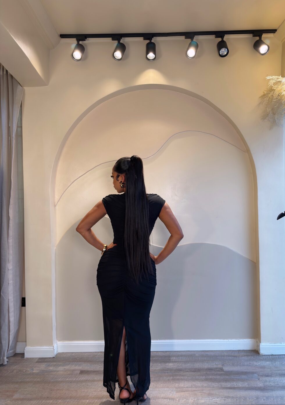 The Dasia Maxi Dress is where classic elegance meets bold confidence. Designed to embrace and flatter the female form, this sleek black gown features a dramatic keyhole neckline and ruched bodice that cinches at the waist, creating an hourglass silhouette. The soft, flowing fabric drapes beautifully down the body, with a thigh-high back slit offering graceful movement and an alluring finish.
