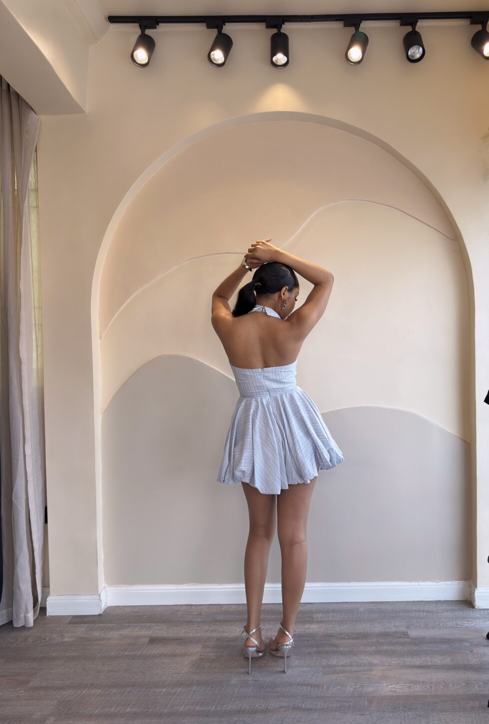 Turn heads effortlessly in the Desiree Mini Dress — a romantic halter-style silhouette that blends charm and confidence in every stitch. Designed with a flared bubble hem and a soft tie-front neckline, this mini dress brings the perfect balance of playful femininity and chic sophistication. Whether for a brunch date, rooftop soirée, or vacation stroll, Desiree makes a statement with ease.