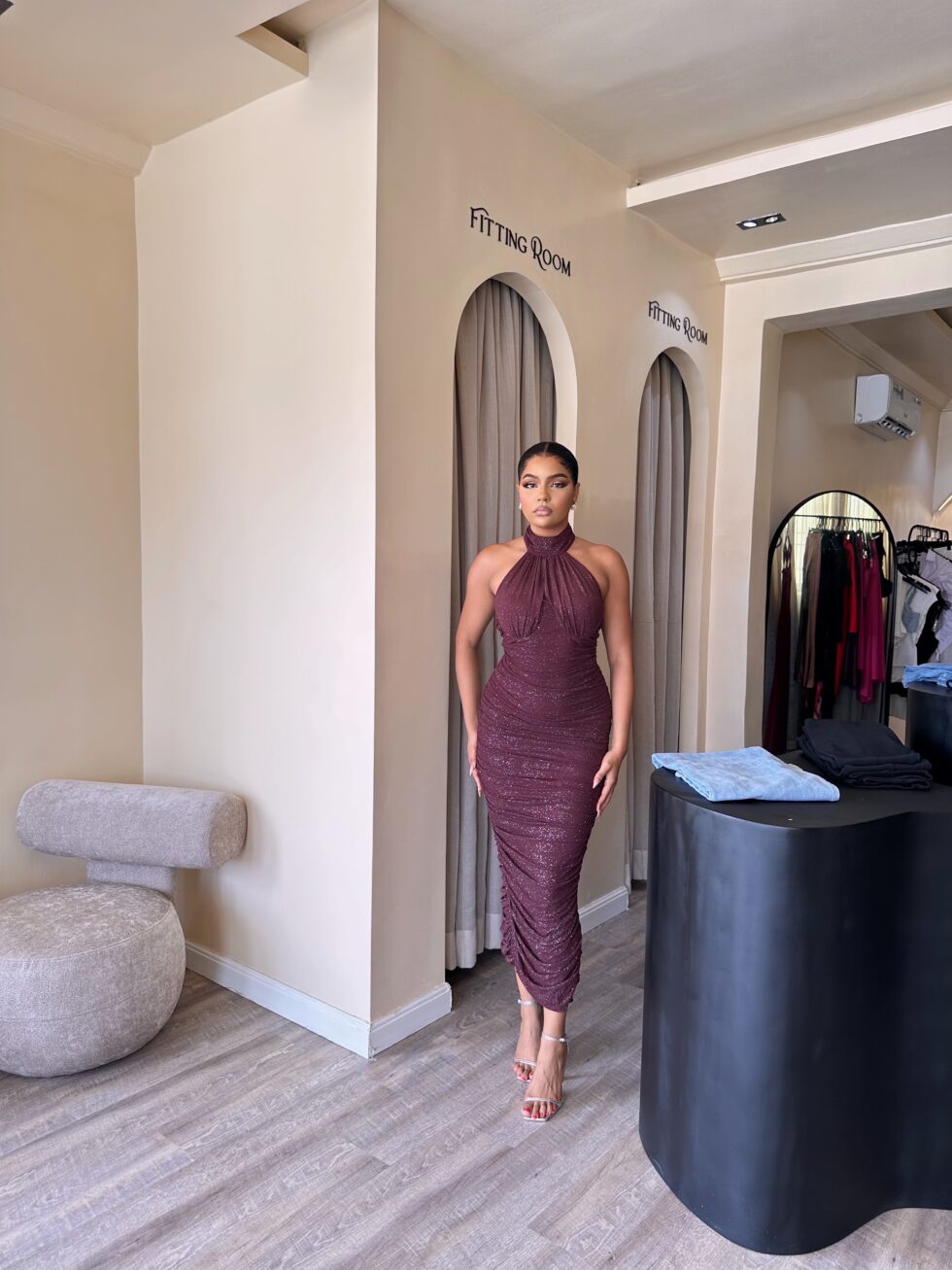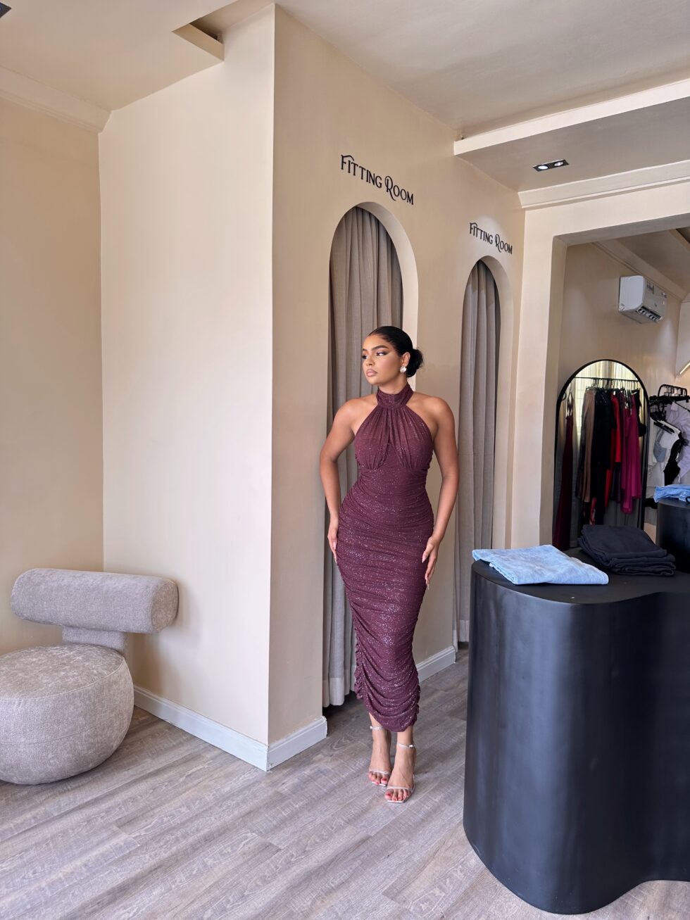 Step into the spotlight with the Evanda Midi Dress, a stunning statement piece designed to turn heads. This figure-flattering silhouette features a ruched body that enhances your natural curves, while the halter neckline adds a touch of refined glamour.