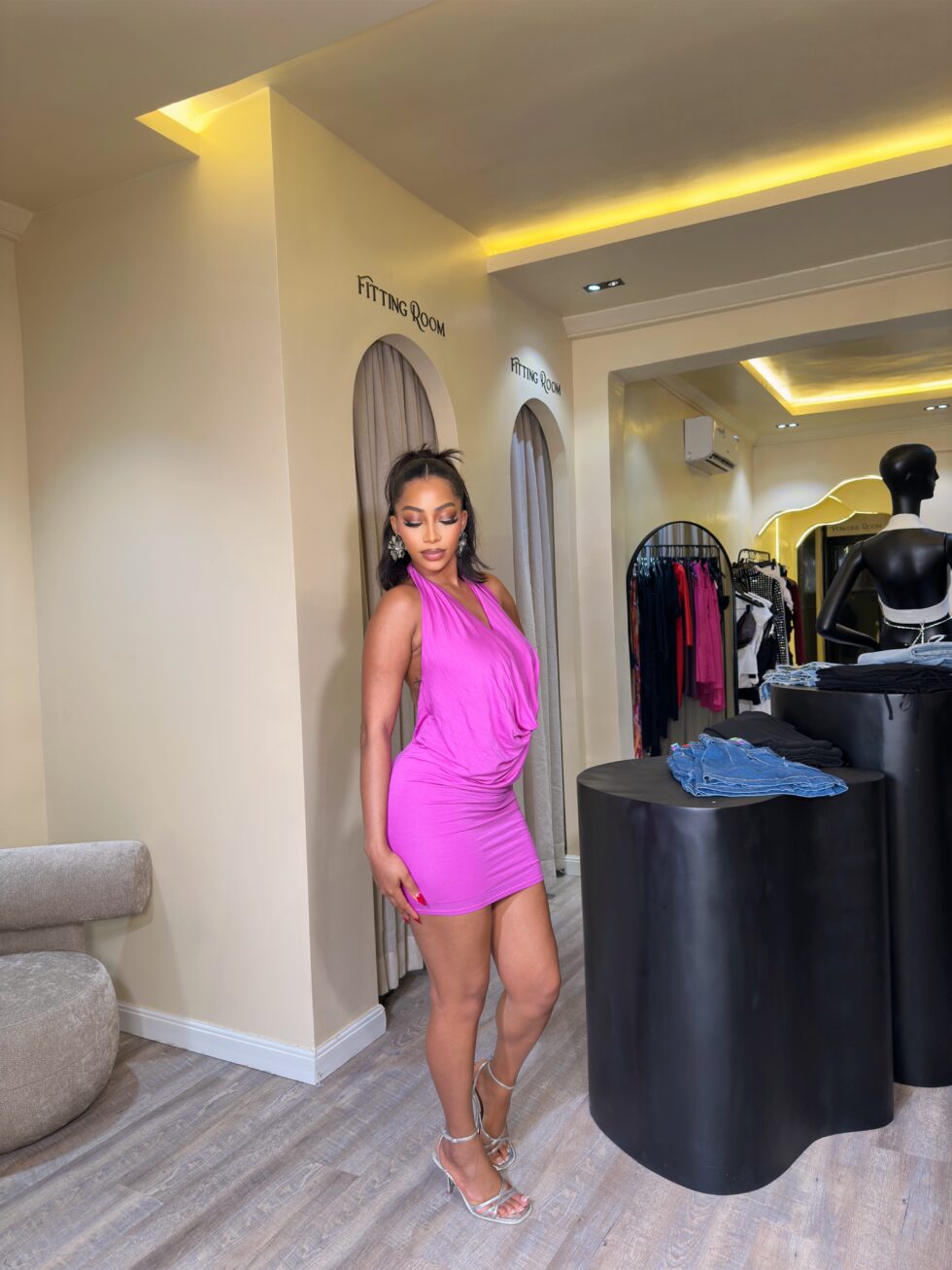 Step into your confident era with the Julia Mini Dress, a show-stopping four-piece set designed to turn heads wherever you go. Crafted in a striking fuchsia pink, this mini dress features a draped cowl neckline, an open-back design, and a curve-hugging fit that perfectly accentuates your figure.