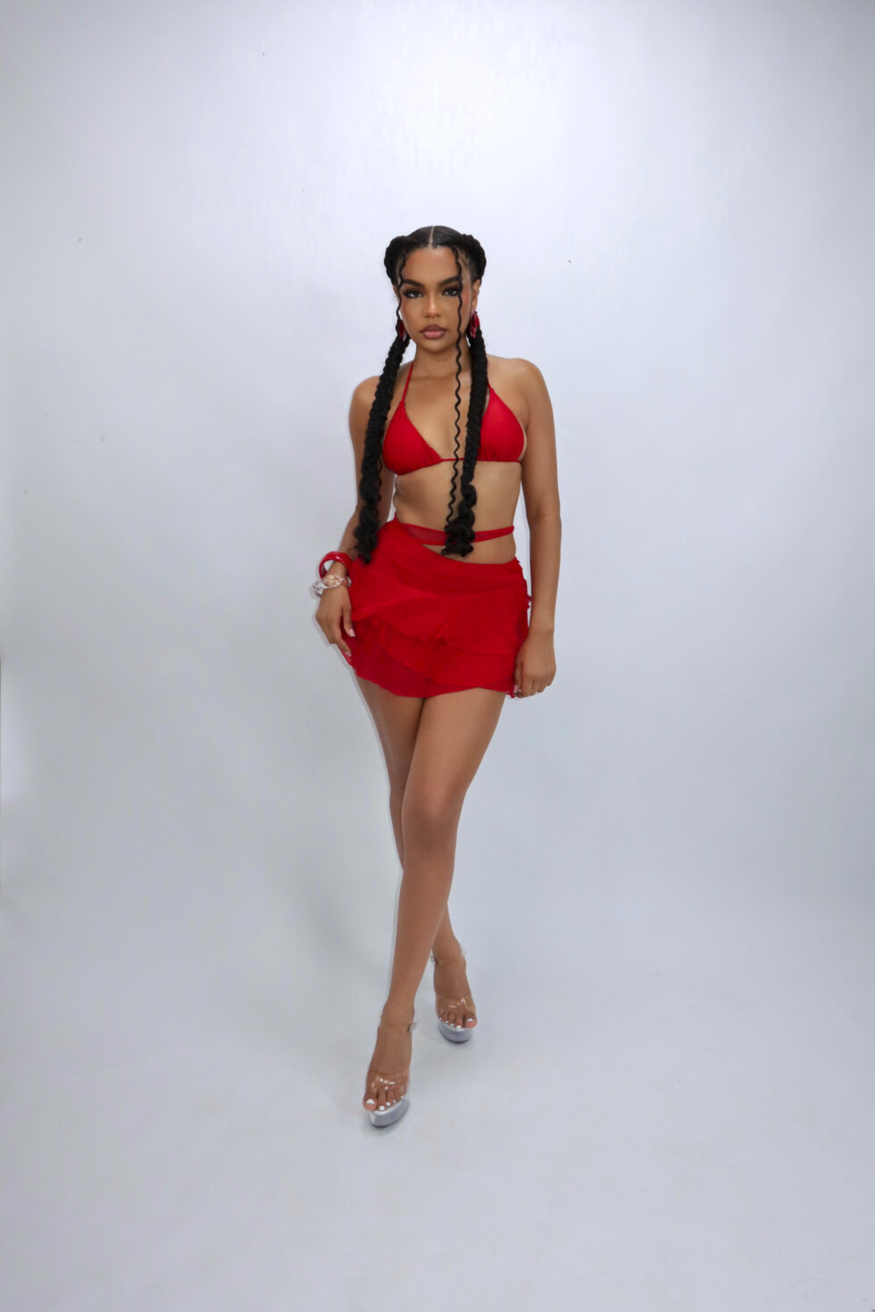 Featuring a playful layered hem and a tie-side waist for an adjustable fit, the Kassia was made for versatility — pair it with your favorite bikini or mix it with a crop top for a day-to-night summer look. Its bold red hue and breezy silhouette make it the statement piece your swimwear wardrobe didn’t know it needed.