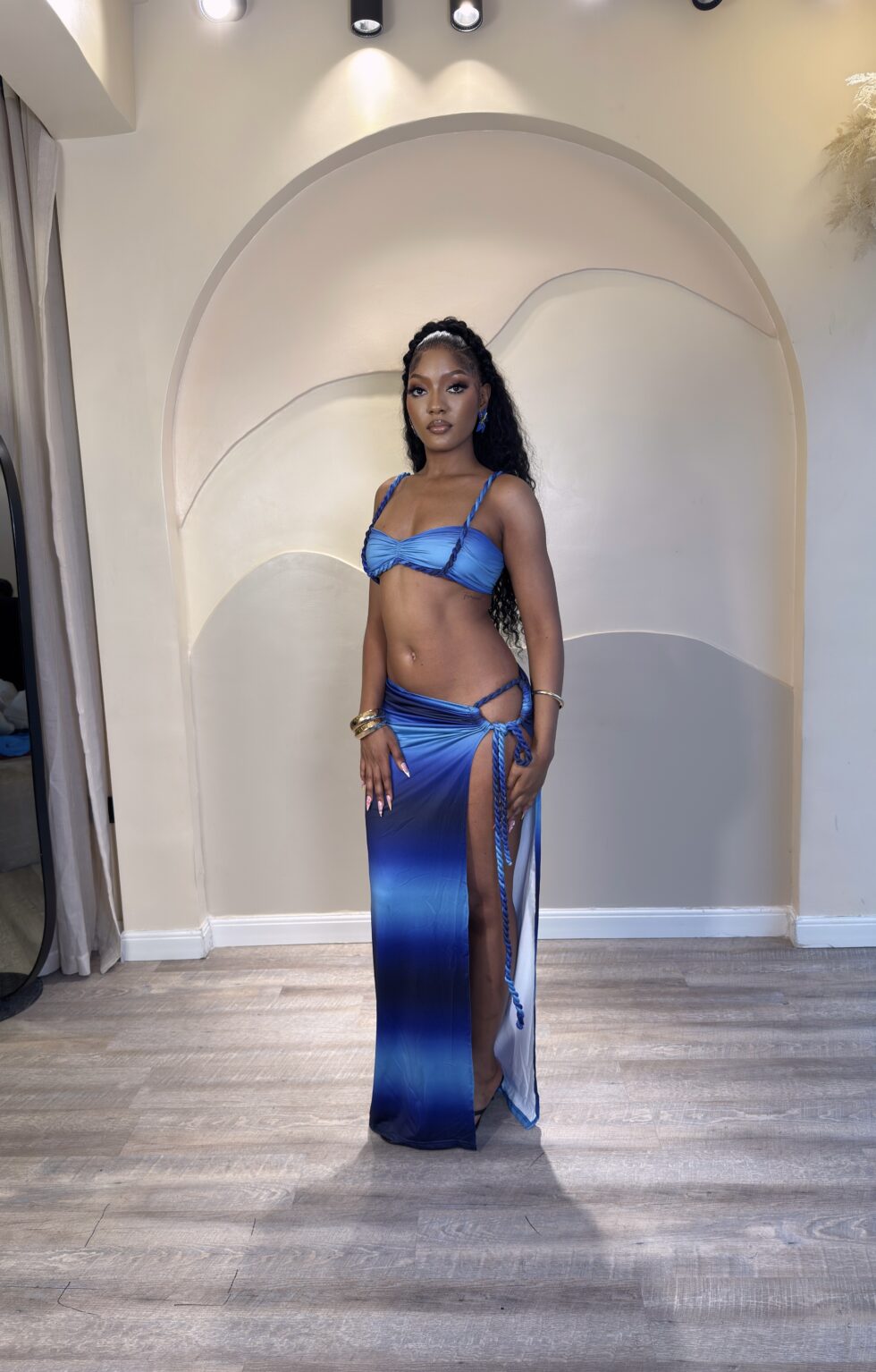 Turn heads in the stunning Ledine Set — a vibrant, two-piece statement featuring a sleek ombré blue finish, sultry side-slit maxi skirt, and a flattering twist-front crop top. Designed for sun-drenched days and elegant nights, it’s the ultimate blend of luxury and allure.