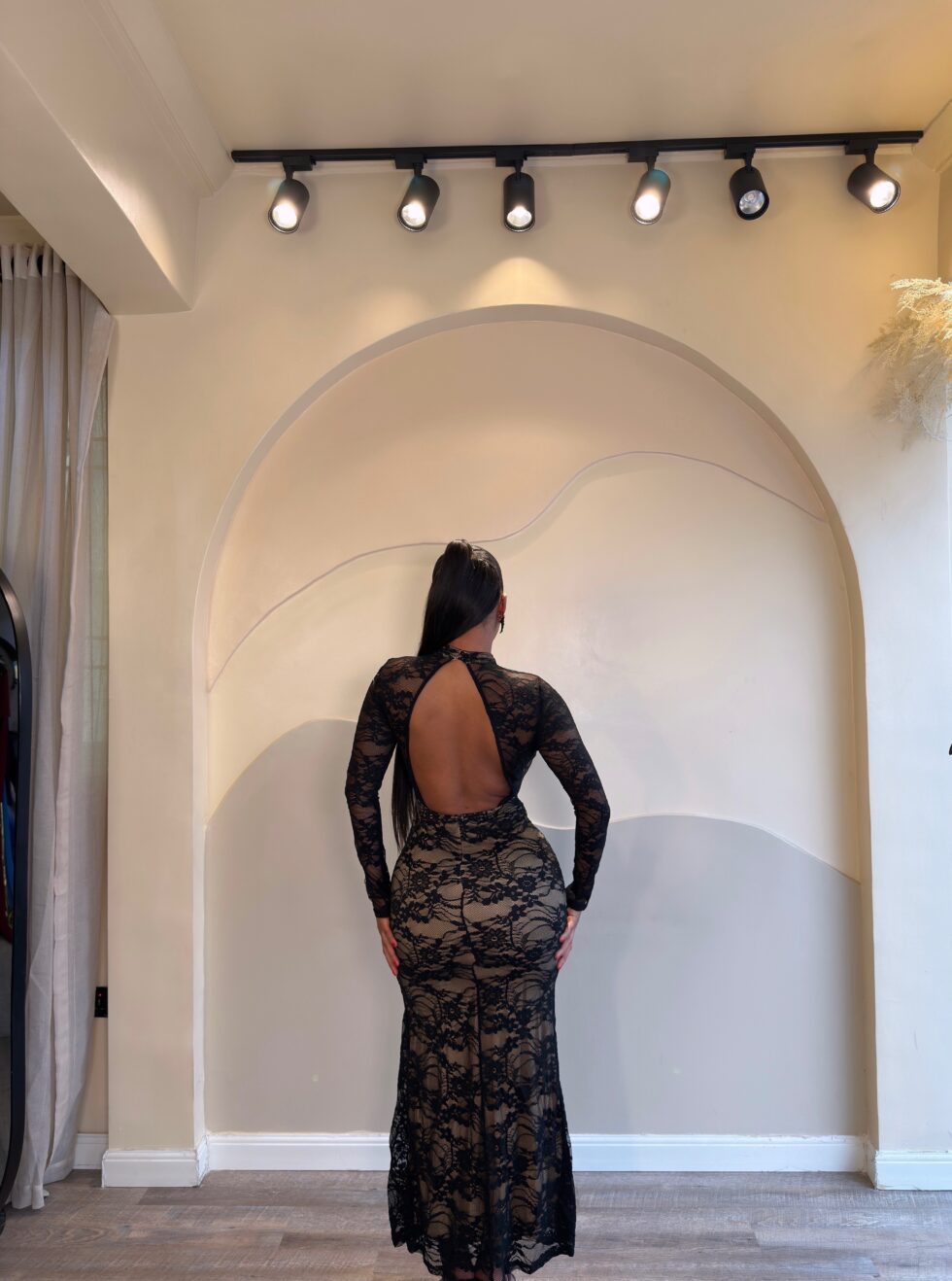 Make an unforgettable entrance in the Lena Maxi Dress — a sultry blend of timeless elegance and modern allure. Crafted from delicate black lace layered over a soft nude lining, this figure-hugging silhouette features a daring thigh-high slit and a high neckline for a perfect balance of sophistication and seduction.