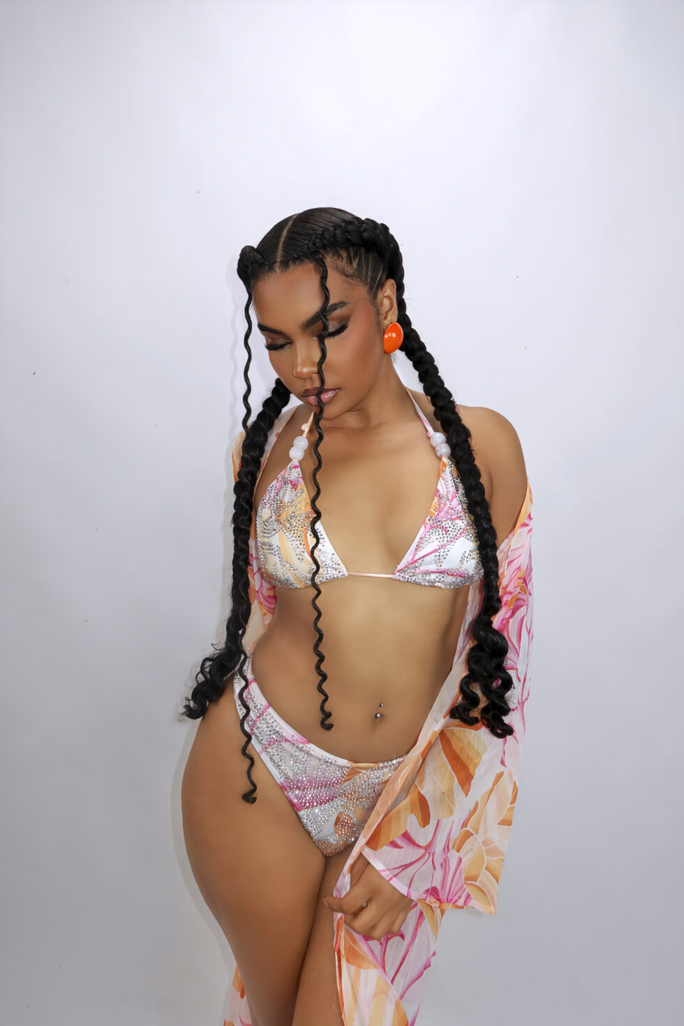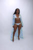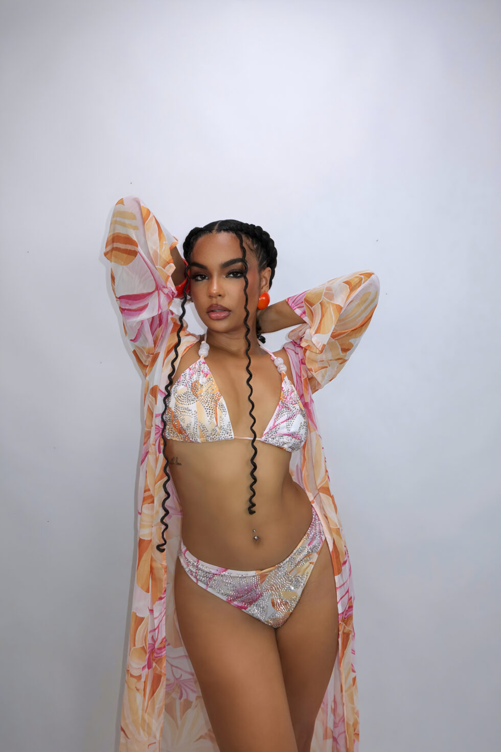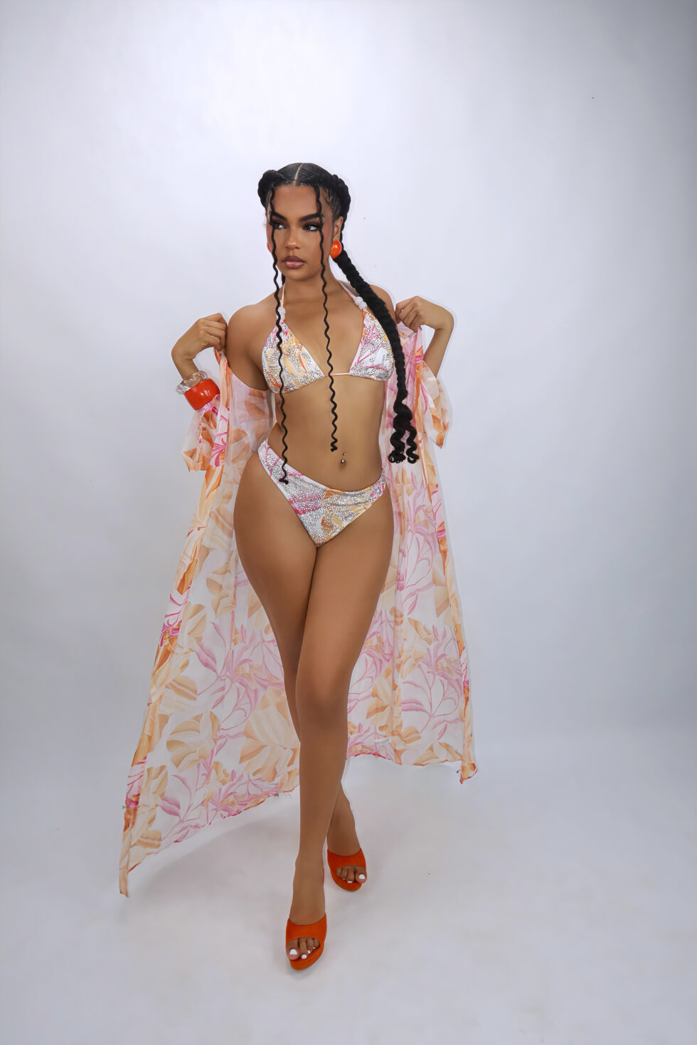 The delicate crystal detailing catches the light from every angle, while the vibrant tropical prints of the cover-up add movement and grace. The triangle bikini top and mid-rise bottoms provide adjustable comfort, while the sheer robe completes the look with a flowy, feminine touch.