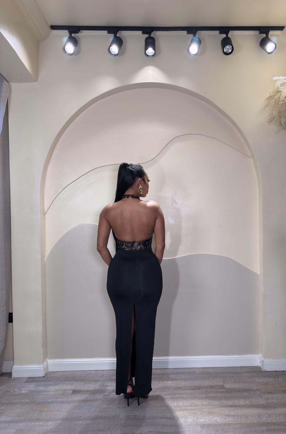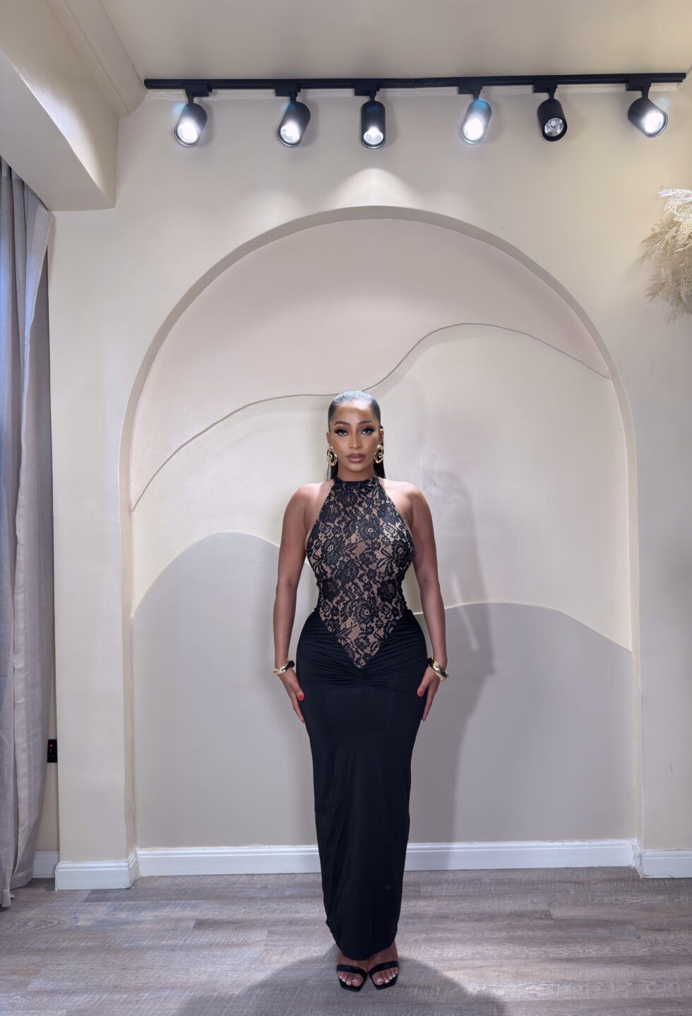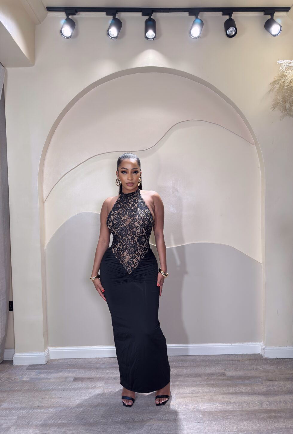 The Marie Maxi Dress is an exquisite figure-hugging gown featuring a sultry lace bodice that flatters every curve and a sleek, floor-length skirt that exudes timeless elegance. The high halter neckline and sheer lace detailing create a striking silhouette, while the open back adds a daring, feminine touch.