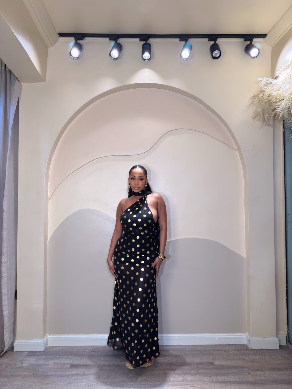Make an unforgettable entrance in our Meilani Maxi Dress, a show-stopping piece that embodies glamour and poise. This gown is crafted from a sheer black fabric detailed with shimmering gold polka dots that catch the light from every angle.