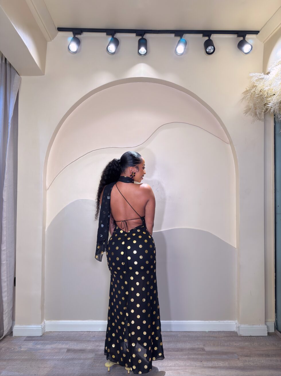 Turn heads in the Meilani Maxi Dress — a breathtaking fusion of sophistication and allure. Designed in a sheer black fabric adorned with luxurious gold polka dots, this statement gown effortlessly flatters your figure with its halter neckline and sultry open-back silhouette. Perfect for evening events, galas, or a romantic night out.
