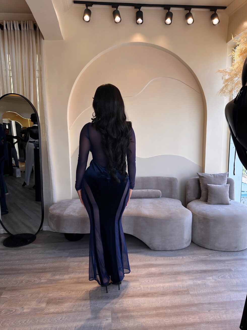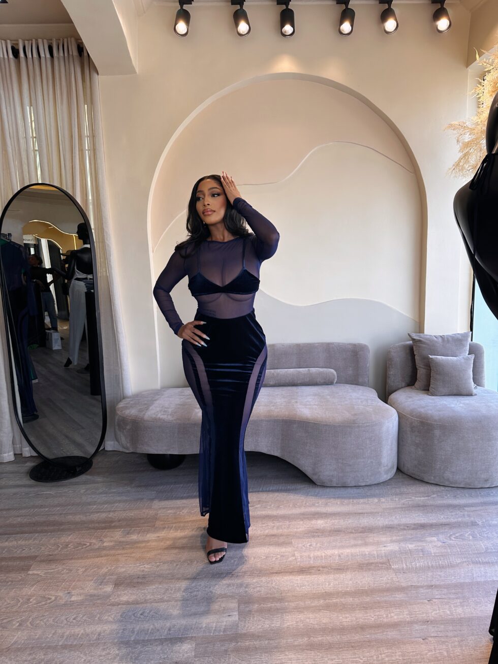A captivating blend of elegance and allure — the Nuru Maxi Dress is designed for the woman who commands attention effortlessly. Crafted from sheer mesh and luxurious velvet, this form-fitting piece sculpts and accentuates your silhouette while exuding timeless sophistication.