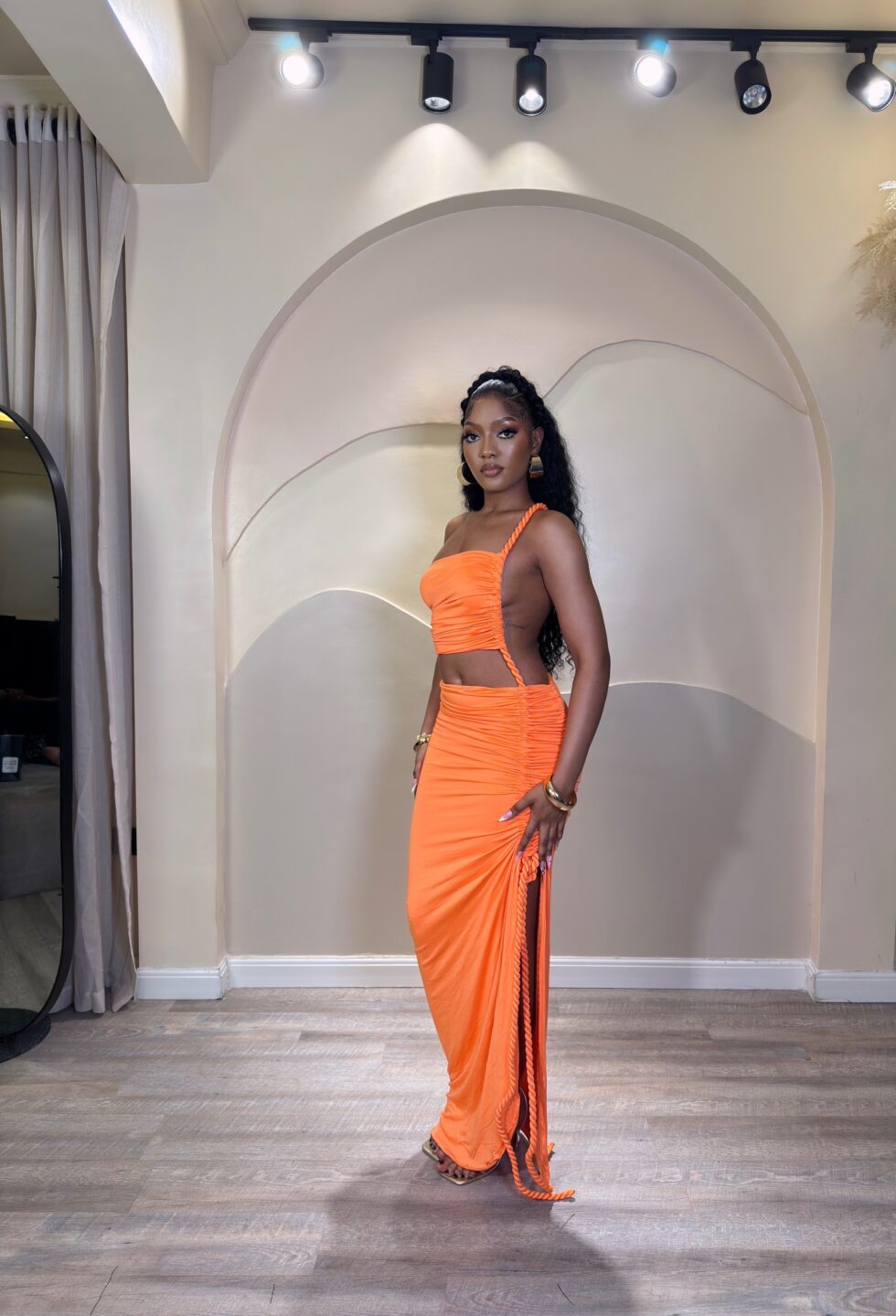 The high side slit with braided tie detailing adds a daring touch, while the radiant orange hue ensures you’ll be the center of attention wherever you go. Whether you’re attending a summer soirée, a beachside dinner, or a night out, the Renae Maxi Dress promises comfort, movement, and timeless allure.