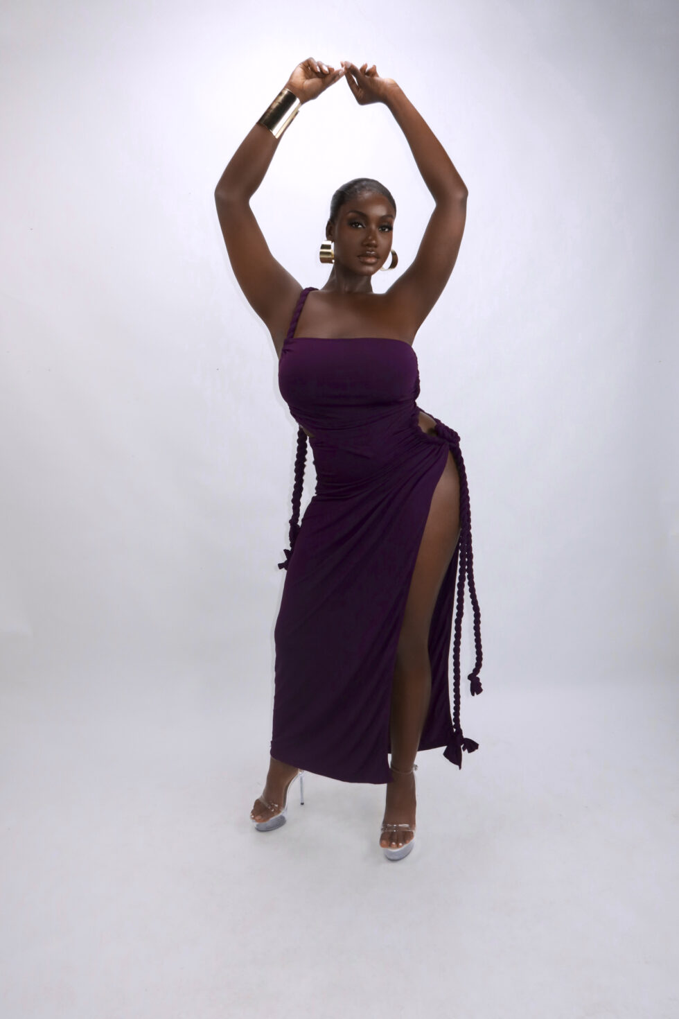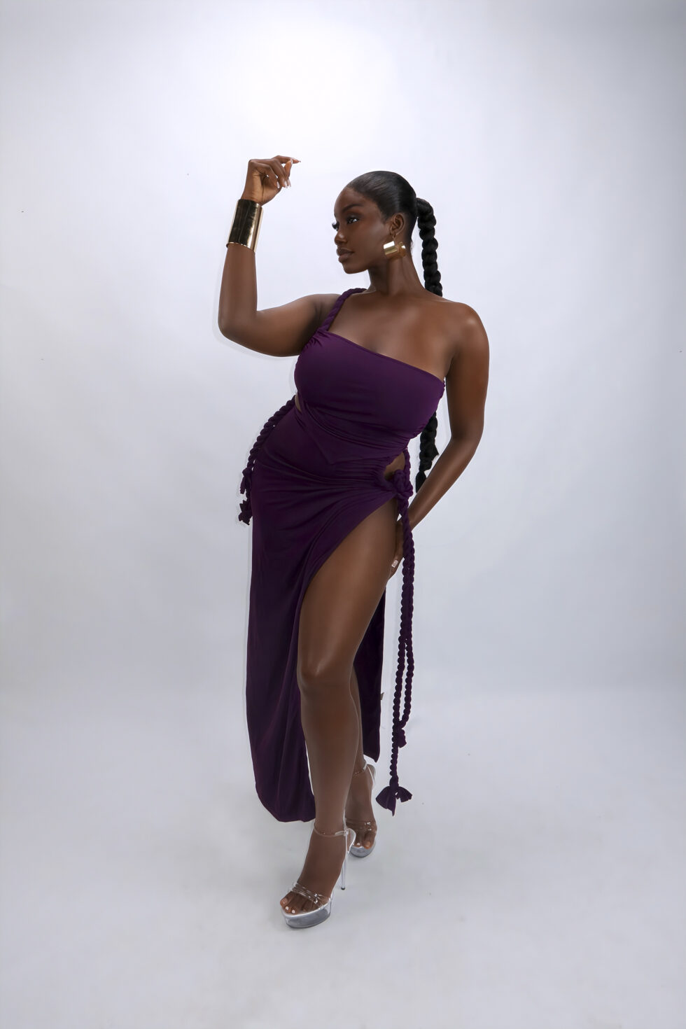 The Scapelli Set is an ode to divine femininity. Designed with a rich, deep purple hue that exudes royalty, this two-piece ensemble features a beautifully draped one-shoulder top with an intricately braided strap and matching wrap skirt. The artful side-tie detailing creates a sculpted fit that flatters every curve, while the daring high slit adds a touch of seductive sophistication.