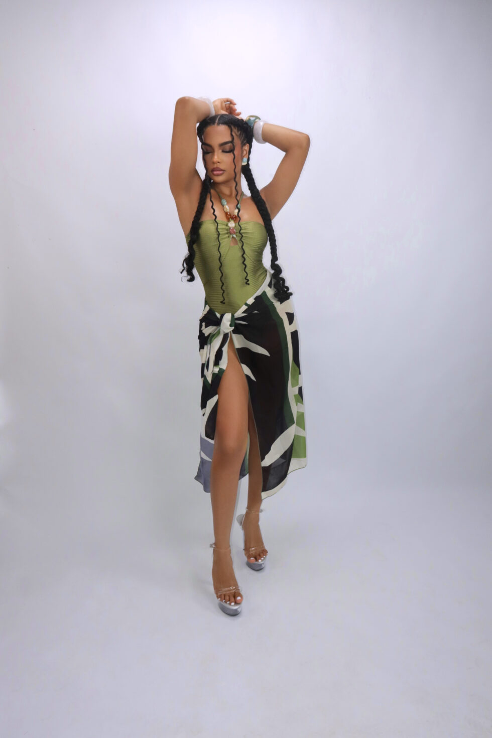 Perfect for poolside lounging or island getaways, the Senci comes styled with a coordinating sarong wrap that can be tied multiple ways — as a skirt, top, or headscarf — for endless vacation versatility.